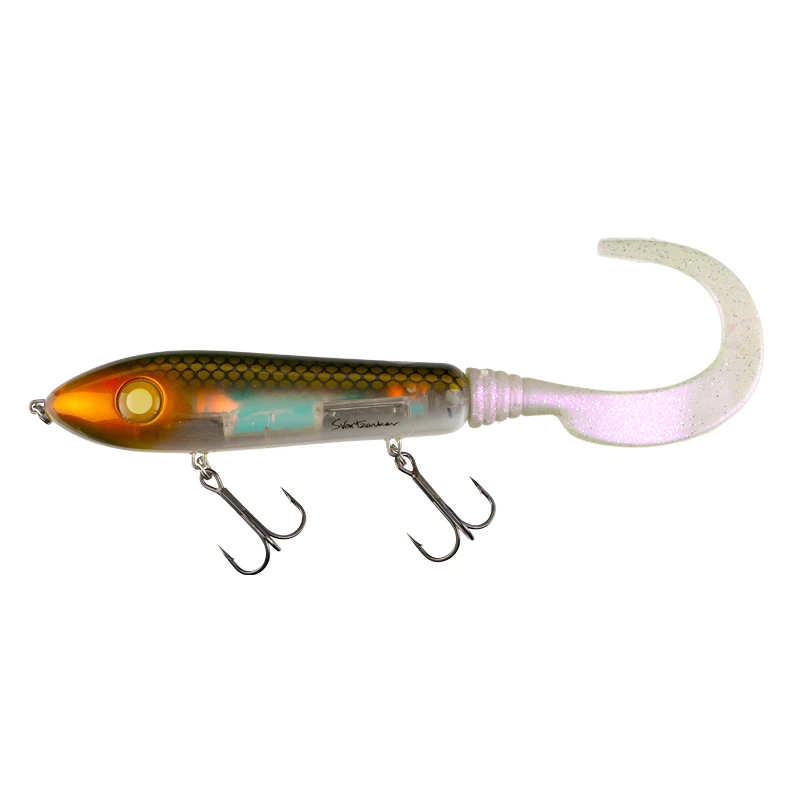 Der Mighty McTail Original hat den Sieg bei vielen Hechtturnieren errungen und viele Trophäenhechte und Muskys gefangen. Dieser Köder ist einfach zu fischen und mit seiner einzigartigen, wieselflinken, gleitenden, bauchrollenden und sich von Seite zu Seite kräuselnden Aktion. Sie wird die Aufmerksamkeit jedes Raubfisches auf sich ziehen. Der McTail ist ein Köder, der auf viele verschiedene Arten gezwickt werden kann, um Ihrem persönlichen Angelstil gerecht zu werden.Es ist ein großartiger Hybrid-Köder, der sehr einfach zu modifizieren ist, montieren Sie ihn mit einem Svartzonker BigTail und er wird ein saftiger Brummer für jeden großen Fisch. Sie können ihn auch mit dem Svartzonker Paddle montieren und ihn in einen auffälligen, rollenden Swimbait verwandeln.• Körper 13,5 cm / 5.3 inches • Körper mit Schwanz 26 cm / 10.2 Zoll • Breites Profil, das viel Wasser bewegt• Edelstahldraht durch den Köder • Handbemalt in super glatten und einzigartigen Farbmustern• Edelstahl-Schwanzschraube für einfache Schwanzmontage• Hochbelastbare Edelstahl-Spaltringe • Bewaffnet mit super scharfen VMC-Originalhaken